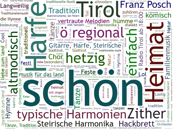 Landler bzw. Walzer, Polka, Boarischer und Marsch: Das sind also heute die gängigen Gattungen in der Tiroler Volksmusik. Genauso, wie sich Sprache im Lauf der Zeit immer wieder geändert hat und sich weiter ändern wird, hat eben auch die Volksmusik sich innerhalb weniger Jahrhunderte gewandelt. Dennoch ist sie nach wie vor bunt. So bunt, dass man sie gerne mit einem Haus, das viele Zimmer hat, vergleicht.